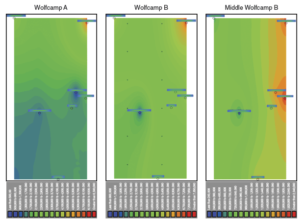 Figure 5 highlights the OOIP maps for the Wolfcamp A, B and Middle B across the study area. These maps help support the evaluation of hydrocarbon accumulation within the study area and potentially the hypothesis of lateral hydrocarbon migration from the Midland Basin axis to the basin’s eastern flanks.
