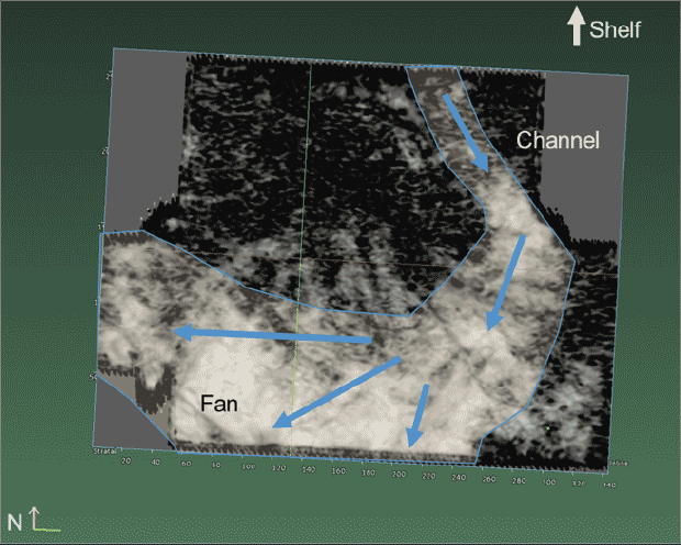 Debris flows and turbidite sediments were sourced from the slope of the Glasscock Nose to the north and northeast of the area, and deposited in accommodation space both in previously existing channels along the slope as channel deposits and along the slope-basin floor transition as basin floor fans.