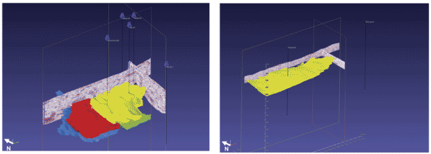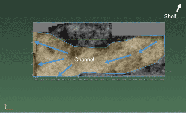 As shown on the left side of Figure 7, four geobodies were identified in the southern survey, representing backfilling channel sands, one on top of the other, deposited as accommodation space became available during sediment deposition. In the Northern survey (right side of Figure 7), one geobody was identified, which is interpreted to be backfilled sand at the base of a channel originating off of the slope around the Glasscock Nose. This interpretation of the geobodies, based on the conditioned post-stack data in both surveys, is consistent with the coherency cube data, our depositional model and existing literature data for the area.