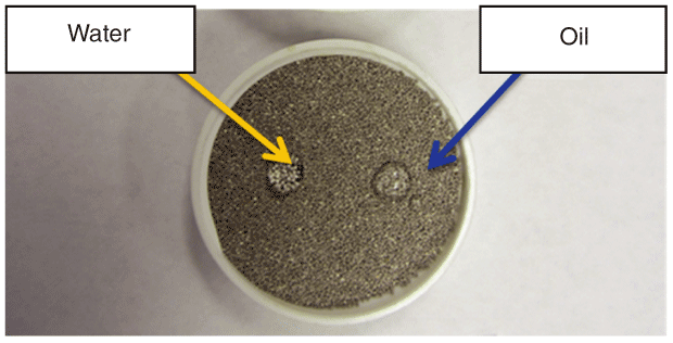 Figure 2 displays an example of the neutral wettability of the modified LWC proppant. A drop of tap water and a drop of paraffin oil were deposited on two areas of the proppant pack surface. Both water and paraffin oil beaded on the new surface, showing that it is neither water- nor oil-wet. The new surface demonstrated no affinity for these two fluids.