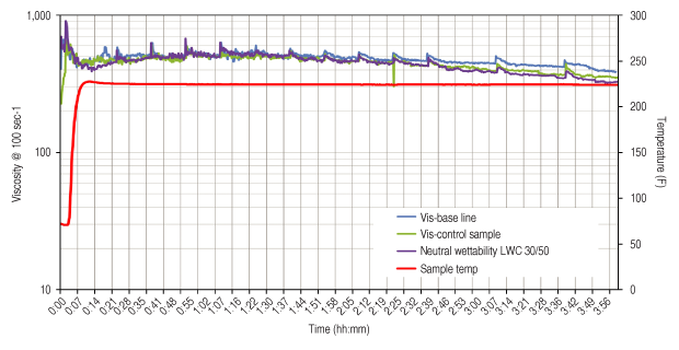Figure 3 shows the viscosity data of the cross-linked fluid that used linear gel containing 4.0 pounds per gallon of neutral wettability proppant compared with a base line that used water that did not contact the proppant and a control that used the same procedure as the neutral wettability, but with an LWC proppant in its native surfaces. The three curves are very similar and the viscosity performance of treated and untreated proppant is similar to the base line. This indicates that the neutral wettability LWC is compatible with the fracturing fluid and the fluid was not affected by any coating chemical. The neutral wettability proppant mixed very well with the gel and showed no aggregation.
