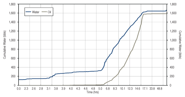 Figure 4 also shows the amount of cumulative oil recovered as a function of time. First oil was observed after 3.8 hours and continued to increase as more water was recovered. After 5.0 hours, oil recovery increased sharply. Both oil and water plateaued after 14.13 hours. During the job, it was observed that the flowback fluids were coming out of the well more quickly than normal for this field. In this area, the total stimulation fluid recovery time was approximately 24.5 hours using a rig.