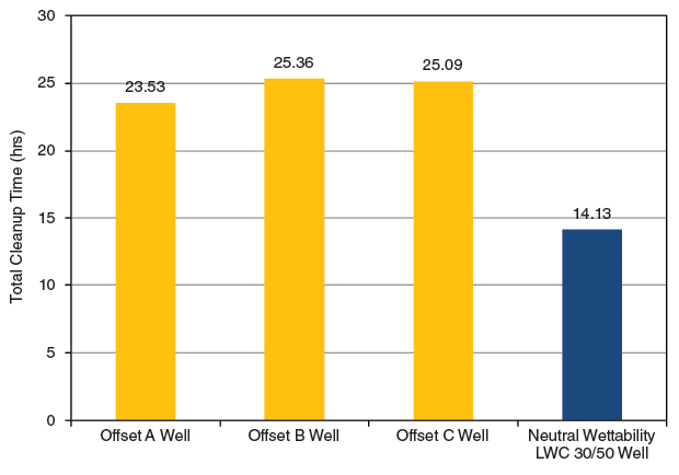 Figure 5 compares cleanup time between the well that used the neutral wettability LWC proppant with three offset wells that used similar ceramic proppants in their native surface states. The well containing the neutral wettability LWC proppant cleaned up about 10 hours faster than offset wells containing similar proppants in their native states. Furthermore, in most cases, not all stimulation fluids were recovered from these wells, indicating that some fluids were still trapped in the proppant pack and creating some damage.