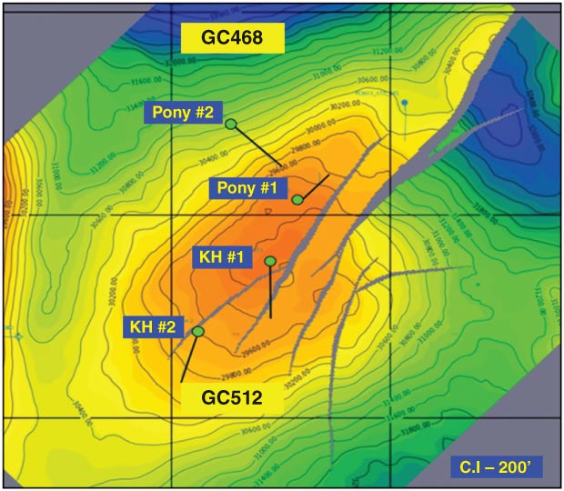 The Pony No.1, drilled to 32,448 feet TD in Green Canyon 468, encountered 475 feet of oil-saturated sandstone. The Pony No. 1 sidetrack was drilled 2,700 feet northeast of the discovery well, reaching 30,634 feet TD and encountering 280 feet of pay. The Pony No. 2 appraisal, located 1.5 miles northwest of the No. 1 well, was drilled to 32,900 feet TD. It was followed by the No. 2 sidetrack 7,400 feet northwest of the discovery well, which was drilled to 33,362 feet TD.