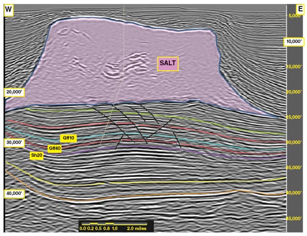 The structure formed as a four-way turtle in response to salt withdrawal from the basin. The evacuated salt formed an approximately 15,000 foot-thick canopy over the structure. Below the salt canopy is a 9,000 foot-thick section (from the base of salt to the base of the reservoir sands) that is composed of deepwater shale and turbidite sand packages in the upper/middle Miocene reservoir. As shown in the dual-coil seismic image in Figure 2, the three key pay intervals in the faulted, four-way structure are the middle Miocene (Serravallian) Gff10s, Gff40s and Sh20s.