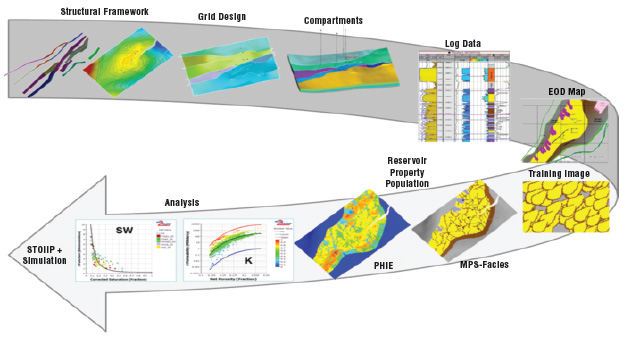 This process of integrating data and information from a variety of sources, tools and methods in the geological and flow simulation model greatly increased our understanding of the geology and petrophysics behind the workflow.