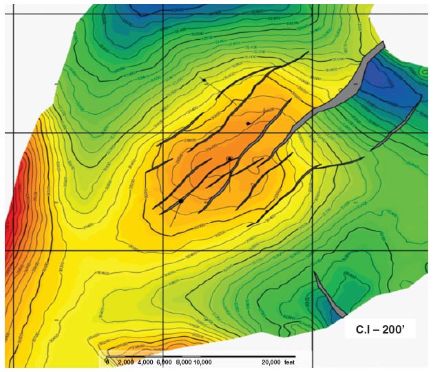 The Stampede Field is a four-way structural closure segmented by faults in Green Canyon blocks 468, 511 and 512. Figure 1 shows a legacy depth structure map of the main reservoir (the middle Miocene Gff40s) from wide-azimuth 3-D seismic data. It also denotes the discovery and appraisal wells. Note the absence of faults in the western flank of the structure.