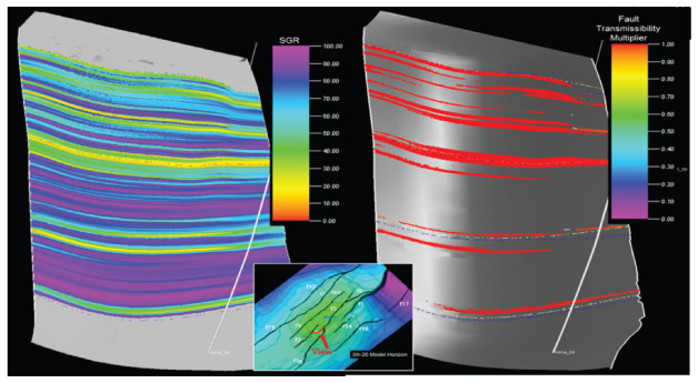 Structural maps, faults, and the geological model with lithology derived from drilled wells and extrapolated across the fields were input into the seal analysis. Fault properties such as throw distribution, shale gouge ratio (SGR), fault zone thickness, and fault zone permeability were calculated and analyzed.