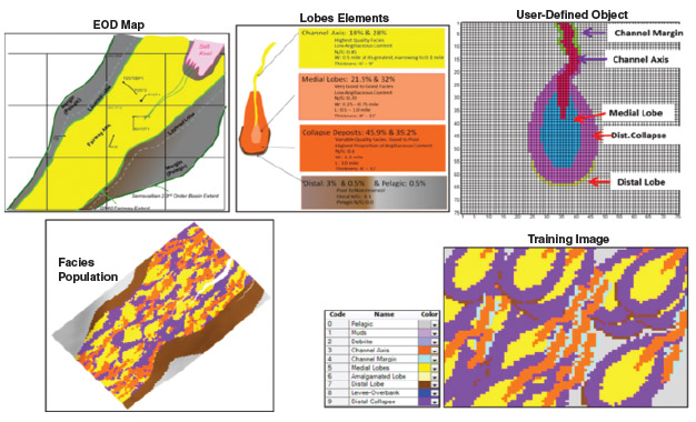 Figure 6 illustrates the multipoint statistics (MPS) facies population approach applied for each reservoir zone to build the geological model. The Gff40s zone is shown here, with the depositional environment scheme, facies elements, and their proportion used for object definition, training image and the final facies model. An object was defined with depositional facies elements (e.g., channel axis, median lobes, etc.), and a training image was constructed using that object. The training image was used to control the facies population in the 3-D geologic model.