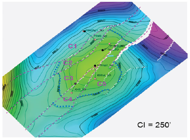 Figure 7 illustrates the outcome of the integration effort at the Stampede Field. It displays the updated depth structure map of the Gff40s reservoir with five compartments (identified by pink dashed lines) and their estimated OWC depths (blue dashed lines). Compartment C1 is an aquifer.