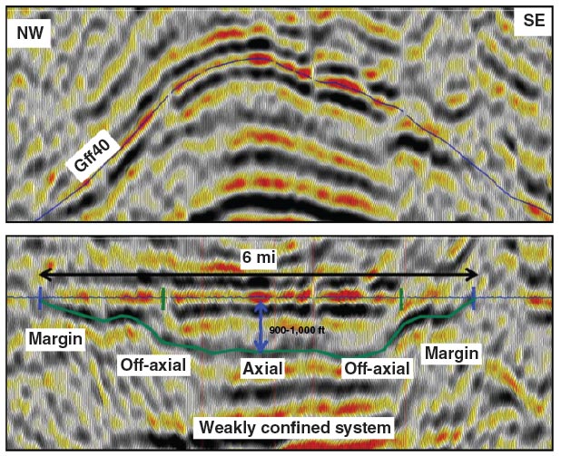 Seismic data were used to determine the lateral extent of the reservoir intervals and their axial, off-axial, and marginal settings. However, the data did not have high enough resolution to determine the details of the facies distribution in the reservoir. To compensate, core data from the reservoir intervals and logs along with outcrop analogs from similar deepwater depositional settings were used to determine facies geometries and distribution.