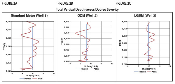 The TVD versus DLS graphs are re-created in Figures 2A-2C. The red line shows the DLS in the well as a result of motor sliding and rotating, while the blue line represents the planned BUR. Large variations in DLS and inconsistency can be seen in both the standard motor and the ODM curves (Figures 2A and 2B). In contrast, the LGSM delivers constant and more predictable BUR from the kickoff point without large variations in the DLS (Figure 2C).