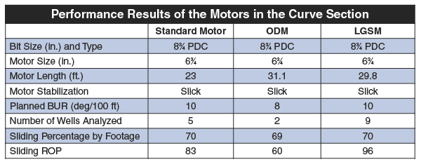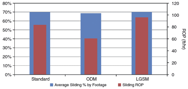 The following results are based on the analysis of the 16 Niobrara Shale wells drilled by Anadarko. The standard motor drilled the intermediate 8-3⁄4-inch sections in two runs (vertical and curve), while the ODM and LGSM drilled both the vertical and curve sections in one run. Comparing the curve sections shows similar sliding footage drilled by the three motors, with LGSM delivering the higher ROP while sliding with PDC bits (Figure 3).