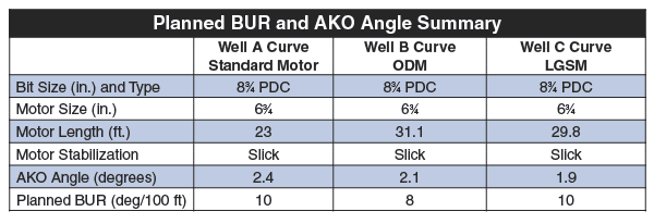 The modeling results led to reducing the planned AKO bend of the LGSM to 1.9 degrees for the intermediate 8-3⁄4-inch hole sections of the wells drilled in the Niobrara. This compares favorably with the 2.4-degree AKO bend of the standard motor and 2.1-degree AKO bend of the ODM. The planned BUR and AKO settings are listed in Table 1.