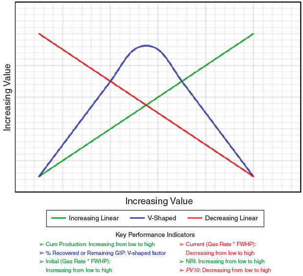 Key performance indicators (KPIs) can help identify better refrac candidates, Abou-Sayed says. As shown in Figure 1, the candidate well selection process can be guided by KPIs such as rising cumulative production, initial productivity (IP) and net revenue interest, and falling current rate and present value of estimated net future revenues at an annual discount rate of 10 percent. To these many curves, Abou-Sayed adds the percentage of remaining recoverable hydrocarbons in place. Together, he says, they highlight the subset of wells with the greatest additional production potential.