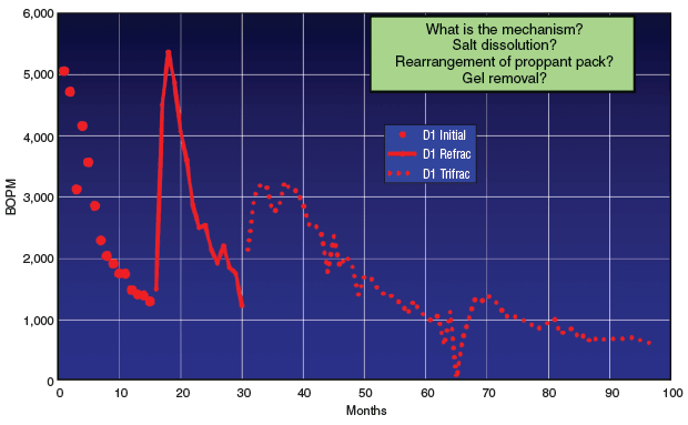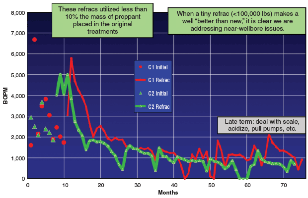 “The key to a successful refrac program is to first identify the suspected failure mechanisms and then design a field test structured to confirm and address the problems,” he advises. “Blindly pumping a refrac without trying to learn what was done incorrectly the first time is engineering malpractice.”