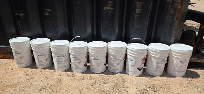 These buckets contain solid chemistries that gradually release their active ingredients down hole to provide lasting protection, Energy & Environmental Services describes. The rate of release varies based on several factors, such as the solid carrier and the environment, but the company says its scale inhibitors usually last 10-18 months.