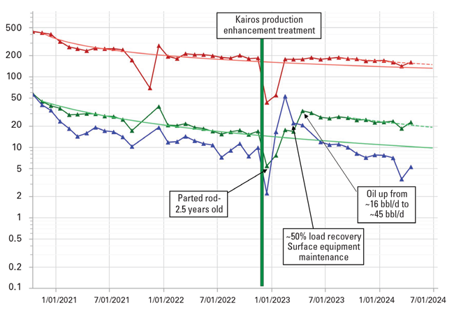 To restimulate wells, Kairos Energy Services says it augments traditional acids with chemical blends that target several production impediments. This graph tracks production from a 2018 well in the Denver-Julesburg Basin that received a treatment designed to improve relative permeability, restore conductivity and remove scale. According to Kairos, the treatment paid for itself within four months by boosting both oil and gas production.