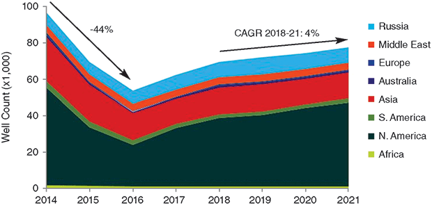 A separate Rystad report issued in November forecast that more than 72,000 wells would be drilled and completed in 2019, representing 3 percent growth over 2018 (Figure 2). “Since 2016, drilling and completion activity has grown 30 percent, and we expect activity to grow at an average annual rate of 4 percent toward 2021,” the report reads.