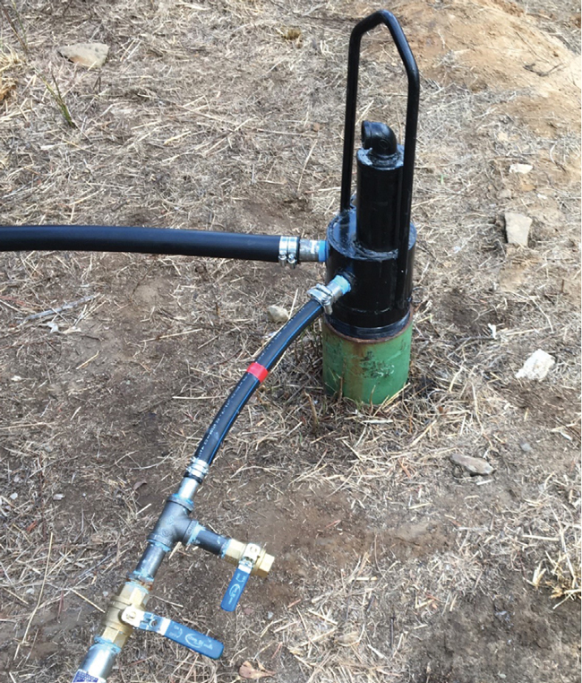 Three stands of polyethylene pipe connect each stage: a red pipe that brings in air, a blue pipe that allows air to return to the surface, and a black pipe that transports the fluid, Sommese describes. “All the air that goes into the pump to displace the fluid vents back out, so none gets mixed with the formation,” he assures. “Because everything is self-contained, the system does not care if the casing has holes or the well is crooked.