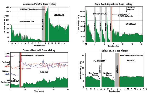 Paraffin, asphaltene, scale and heavy oil case history graphs show stabilization and increased production at the end of standard workovers after installing the Enercat™ downhole tool from Revelant Nanofluidity Technology.