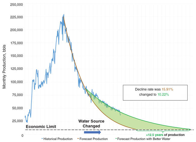 “In an old conventional well, injecting the right water should bump up production and flatten the decline curve for a few years, then put the well back on its old curve. By that point, the well should be on track to get 10% or 15% more of the OOIP.