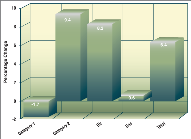 Respondents to the 2016 survey say they anticipate increasing this year’s drilling activity by 6.4 percent compared with 2015. More active drillers (category 2)–those who plan to drill six or more wells this year–are most positive, projecting a 9.4 percent increase over 2015 (Figure 1). Less active drillers (category 1)–those who expect to drill 0-5 wells this year–are less upbeat, predicting a 1.7 percent decline in total drilling.