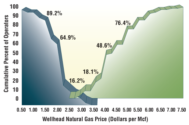 Percentages in Figures 2A and 2B represent the cumulative total of survey respondents that indicate they would have altered their 2016 drilling plans by the time the spot price for West Texas Intermediate crude oil delivered at Cushing, Ok. (Figure 2A), or the wellhead natural gas price (Figure 2B) reached the indicated amount. Prices at which drilling would decrease are plotted to the left of the graphs in downward curves; prices at which drilling would increase are plotted to the right of the graphs in upward curves.