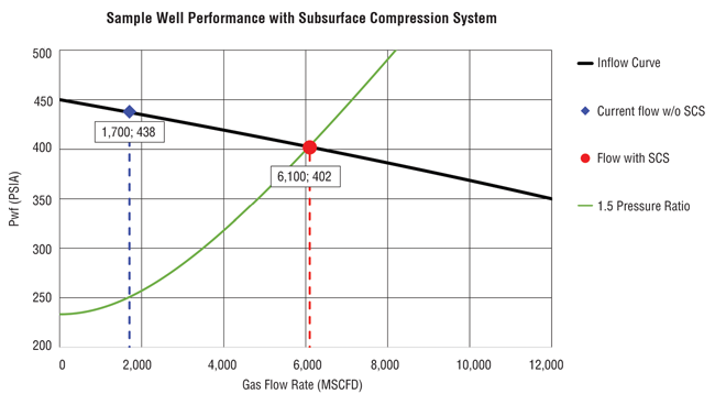 To address liquid loading, Upwing has developed a subsurface compression system that raises gas velocities enough for the gas to carry the liquids to surface. In field trials and simulations, this technology has increased gas production at least 20% and as much as 200%, Artinian reports. He adds that it increases condensate production.