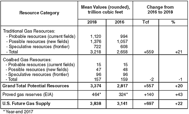 When PGC’s assessments of technically recoverable resources are combined with EIA’s latest determination of proved reserves of 464 Tcf as of year-end 2017), PGC says the future U.S. gas supply stands at a record 3.838 Qcf, an increase of 697 Tcf (22%) over the previous evaluation.