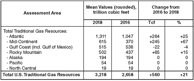 Table 2 compares the year-end 2018 area-level assessments of traditional gas resources (conventional, tight sands, carbonates and shale reservoirs) with year-end 2016.