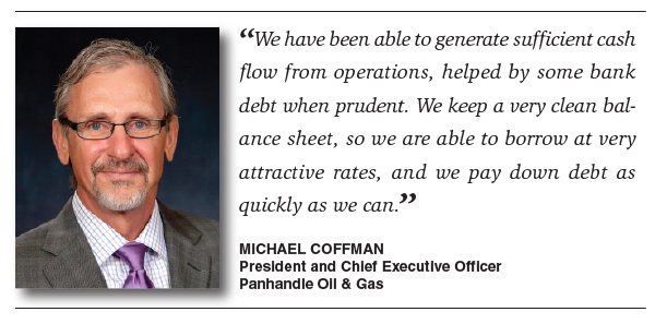 In 2007, the company’s name was changed to Panhandle Oil & Gas Inc. That change was made to end confusion as to the nature of the company’s operations, Coffman says, commenting, “Panhandle has never been a royalty trust and is not strictly a royalty company. Panhandle pays dividends on its common shares.”