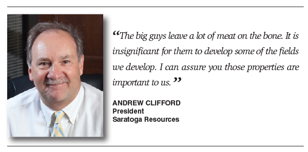 “We keep 100 percent working interests in all our wells,” declares Saratoga President Andrew Clifford. “We are exploring some partnerships, but those would be with firms around our own size. We try to stay away from the really large players that can ‘AFE’ you to death. When things get tight, we can scale back and wait for better conditions.”