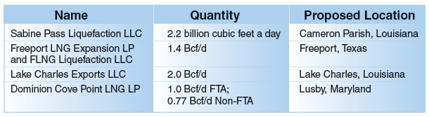 After a significant time lapse following its conditional approval of Cheniere’s Sabine Pass liquefaction project, DOE has conditionally approved LNG export applications from Freeport LNG Expansion LP and FLNG Liquefaction LLC (May 2013), Lake Charles Exports LLC (August 2013), and Dominion Cove Point LNG LP (September 2013). Table 1 shows LNG export approvals as of Sept. 19.