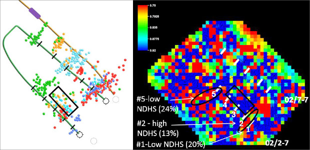 Figure 1 shows one of the 3-G workflow outputs from the Montney Shale, displaying the normalized differential horizontal stress with the maximum horizontal stress direction. The red zones, such as those highlighted with ellipses around stages 1 and 5 of the No. 02/2-7 well, represent low normalized differential horizontal stress values where production logs show the best frac stage performance of at least 20 percent. The worst frac stage performance at Stage 2 (13 percent of 02/2-7 well production) is mainly surrounded by high normalized differential horizontal stress values, which could explain its poor performance.