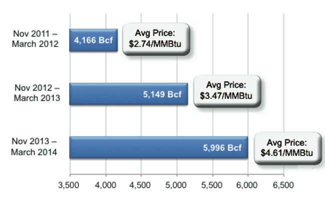 Figure 1 shows space heating demand in billions of cubic feet and natural gas prices over the past three winters, while Figure 2 shows New York Mercantile Exchange front-month natural gas contract prices since January 2012. Not surprisingly, gas prices have been much stronger over the past two winters in correlation to increased heating demand.