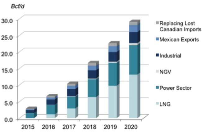- A tsunami of liquefied natural gas exports from the United States to overseas markets, with daily U.S. LNG export volumes forecast to reach 12 Bcf-15 Bcf by the end of the decade;