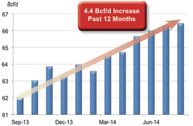 Prior to this year, these increases were partially offset by rapid declines in production from the Haynesville Shale. However, with continued efficiency improvements and cost declines, Haynesville gas production has now plateaued. In addition, production in the remainder of the United States also is likely to increase slightly on a net overall basis, in part because of associated gas production in Eagle Ford Shale and Permian Basin oil plays. Therefore, if anything, growth in production over the next 12 months could exceed EIA’s 4.4 Bcf/d estimate.