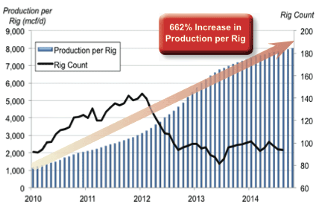 Marcellus Shale Natural Gas Production per Rig and Rig Count Since 2010