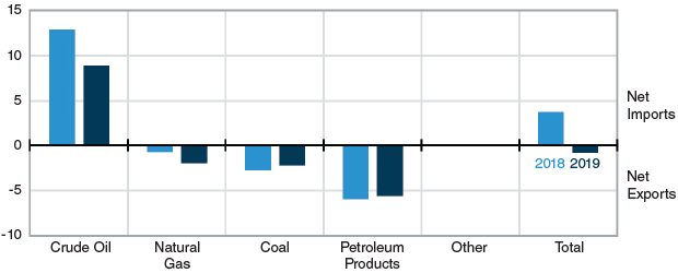 In 2019, the United States continued to be a net importer (importing more than it exports) of crude oil and to a much smaller degree electricity, and a net exporter of natural gas, petroleum products, coal and biomass. The agency points out that net change in U.S. energy trade–from 3.6 quadrillion Btu (quads) of net imports in 2018 to 0.8 quads of net exports in 2019–was the largest since 1980.