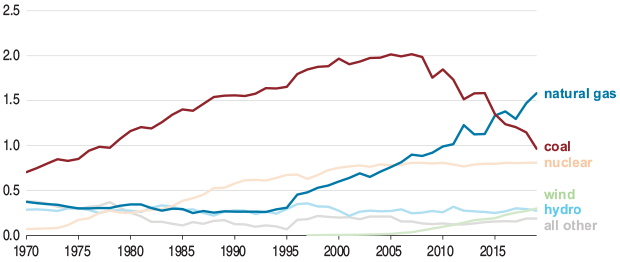 At the same time, output from the coal-fired generating fleet dropped to 966,000 GWh, the lowest level since 1976. The decline in coal generation levels was the largest percentage decline in history (16%). Although lower electricity demand in 2019 was partly responsible for less coal-fired generation, the agency says the primary driver was increased output from natural gas-fired plants, and to a lesser degree, wind turbines, which generated 300,000 GWh.