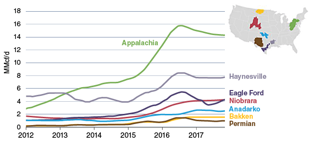 The Appalachian Basin is the key driver in U.S. production growth. According to EIA data, Appalachian gas production jumped by more than 8.0 billion cubic a day between the end of the third quarter of 2015 and the end of third-quarter 2017. In September, regional production increased by 350 million cubic feet a day from August to total 24.6 Bcf/d–nearly three times the daily output in the Permian Basin for the month, and almost four times the daily volumes in the Haynesville Shale.