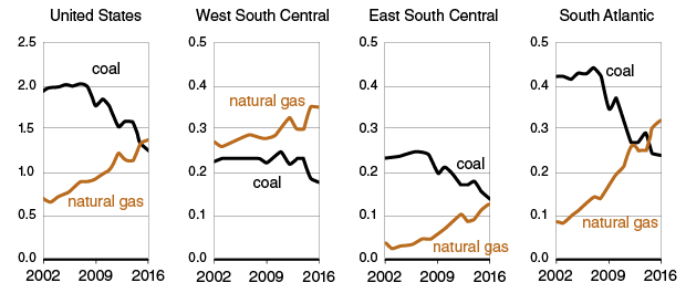 Nearly 21.0 gigawatts of coal-fired generating capacity were taken offline across the South between 2006 and 2016. Although 9.6 gigawatts of new coal-fired capacity were added over that decade, no coal units have been installed since 2013. During the same time, electricity generators installed 47.0 gigawatts of natural gas-fired capacity.