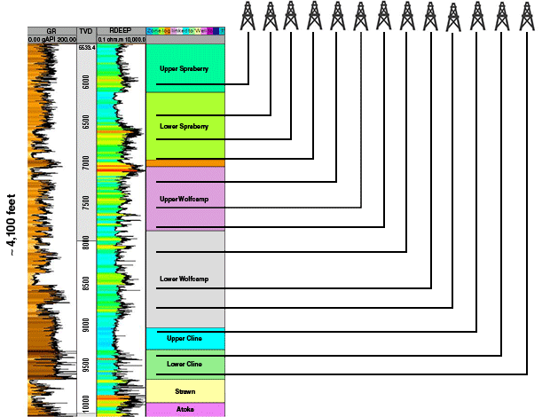 The Midland Basin consists of a 2,500- to 4,500-foot thick section that includes the Spraberry, Wolfcamp and Cline formations. A typical log profile of the entire play, as well as potential targets, is shown in Figure 1.