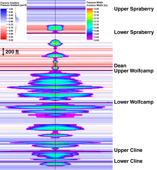 Figure 2 shows the results of the planar 3-D simulations. The stress profile allows the majority of the hydraulic fractures to be isolated from the fractures above or below them, with only two landing points showing some overlap. These fractures were then gridded and input into the numerical reservoir simulator to gauge the production potential. Known pressure/volume/temperature (PVT) data and relative permeability curves for the Spraberry and the Wolfcamp formations were used and cross-checked with the literature.