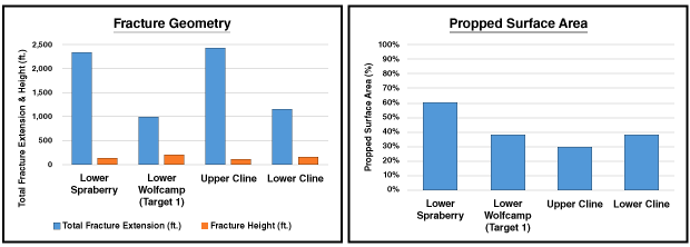 - 1,500 (Upper and Lower Spraberry) to 1,800 (Upper and Lower Wolfcamp and Cline) pounds of proppant per foot;