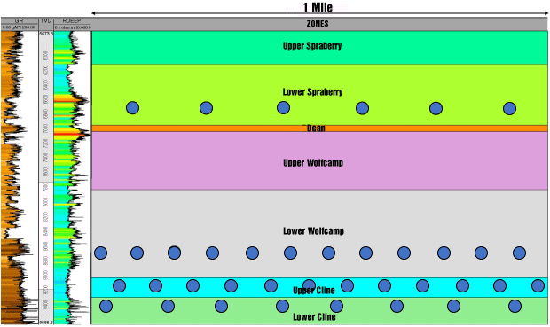 The pilot logs show considerable variation in properties such as porosity and stresses in the different zones. Based on good reservoir and completion data, 20 points were picked as potential landing locations: one in the Lower Cline, two in the Upper Cline, six each in the Lower and Upper Wolfcamp, three in the Lower Spraberry, and one in the Upper Spraberry.