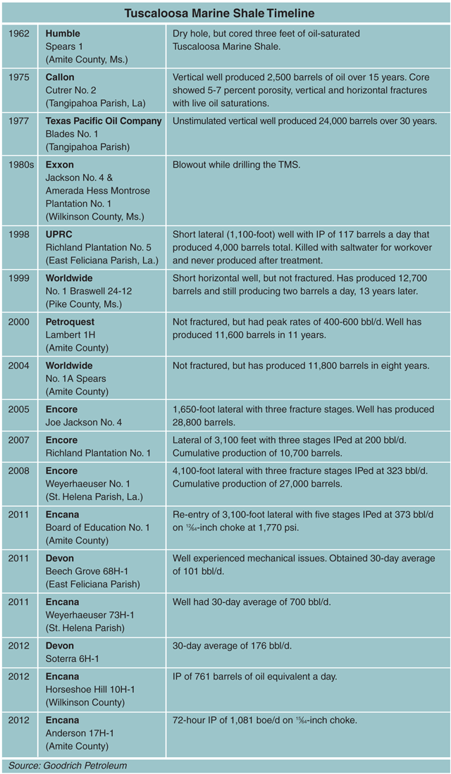 According to Robert Turnham, president of Houston-based Goodrich Petroleum, a signal well for the Tuscaloosa Marine Shale could be the Anderson 17H-1 in Amite County, Ms. The well is being operated by Encana Corporation, and Goodrich has a 5 percent interest. Not only was the initial production more than 1,000 barrels a day, the 30-day average held at slightly less than the IP rate, Turnham says.