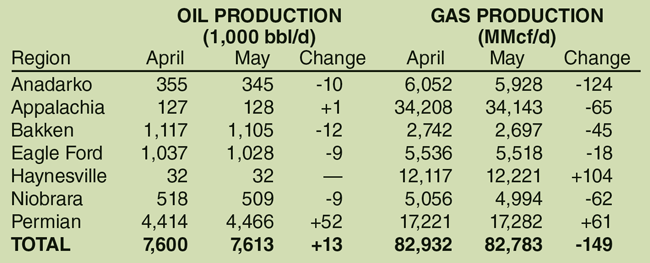 In its latest Drilling Productivity Report, EIA projects that the major shale basins will produce 7.6 MMbbl/d of oil and 82.9 Bcf/d of gas in April (Table 1). That compares with 8.7 MMbbl/d of oil and 82.9 Bcf/d of gas in April 2020. The Permian is expected to average 4.4 MMbbl/d compared with 4.6 MMbbl/d a year earlier. Oil output in the Bakken is estimated to average 1.1 MMbbl/d versus 1.4 MMbbl/d in April 2020, while the Niobrara is pegged at 518,000 this April compared with 782,000 last April.