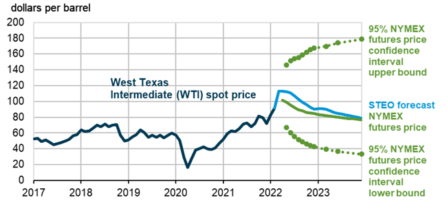 However, EIA’s forecast calls for inventory draws to ease and gradually turn into builds. “Although we reduced Russia’s oil production in our forecast, we still expect that global oil inventories will build at an average rate of 0.5 MMbbl/d from the second quarter of 2022 through the end of 2023, which we expect will put downward pressure on crude oil prices,” the STEO states. “However, if production disruptions in Russia or elsewhere are more than we forecast, resulting crude oil prices would be higher than our forecast.”